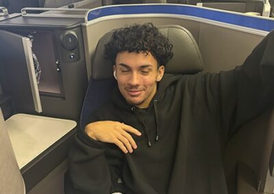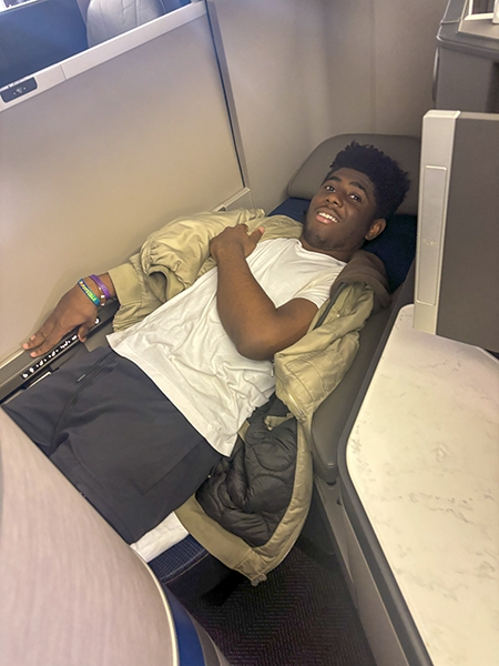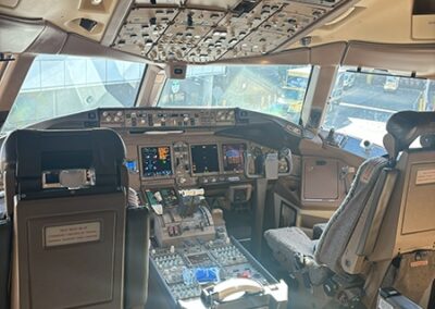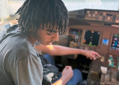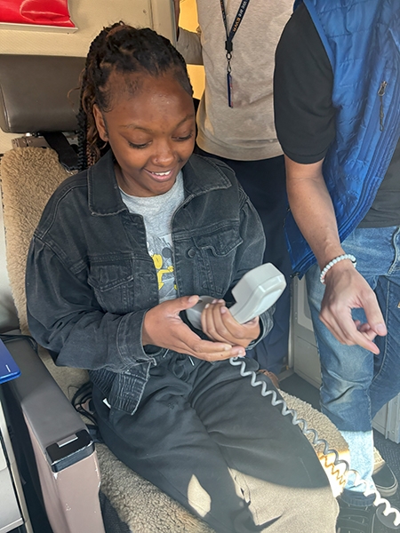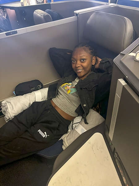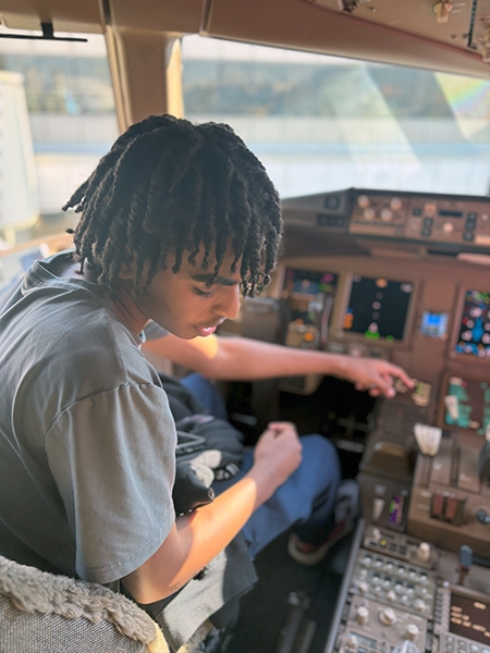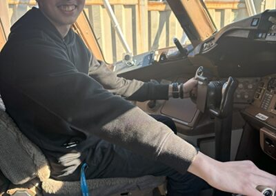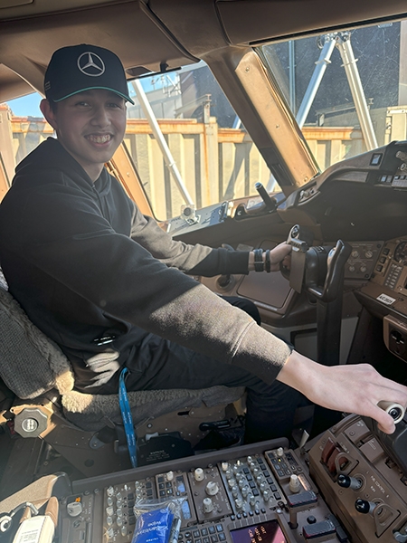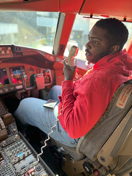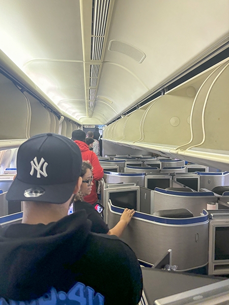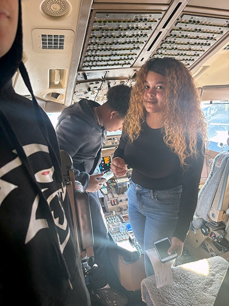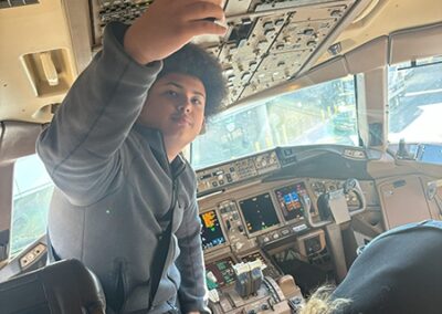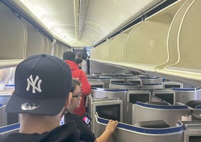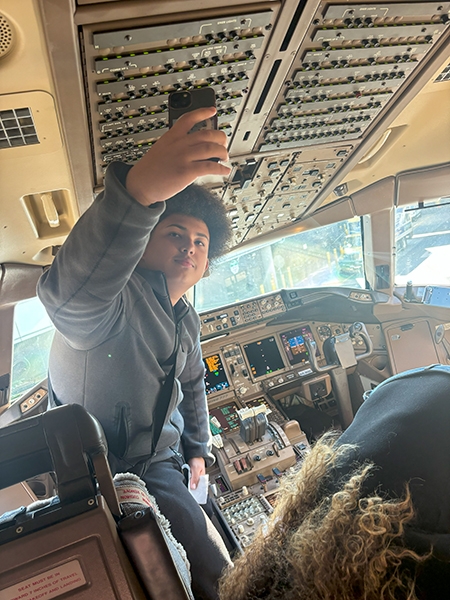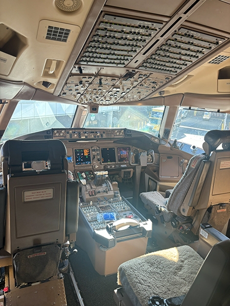 Following lunch, the students boarded a Boeing 777, one of the largest planes flown by the airline. They made public address announcements at the gate and onboard the aircraft, visited the flight deck, experienced the fully reclining seats in first class, and explored the rest of the plane.